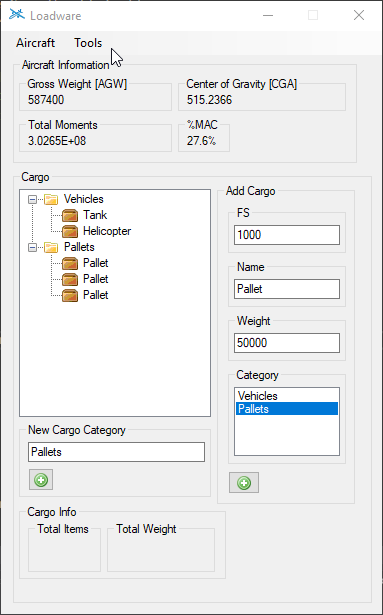 - Add and categorize the types of cargo on your aircraft. Have a lot of food cargo, but don't want it showing up with the ammo? You can categorize these into their own tree views for convenience.